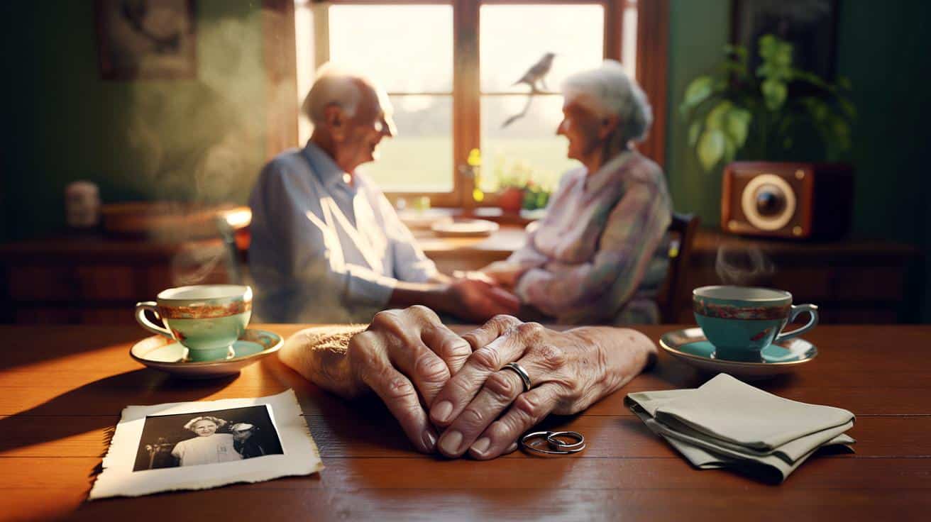 Auf dem Küchentisch liegt ein gefaltetes Foto, an den Rändern weich wie Stoff. Zwei Hände treffen sich in der Mitte, alt und warm, der Ring hat eine kleine Kerbe in die Haut gezeichnet. Kein großes Wort, nur ein Nicken, als wäre die Zeit selbst zu Gast. Ein Radio rauscht, ein Vogel schreit draußen, der Tee dampft. Und doch liegt in dieser kleinen Szene die waghalsigste Behauptung des Lebens: Wir halten zusammen, jeden Tag. Dann ein Lächeln, das mehr sagt als ein Ritterschlag.